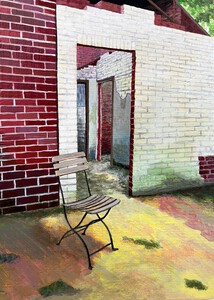 2020In hetzelfde gebouw als de wasbak stond in een gang op de begane grond deze stoel. Ietwat verbogen en haveloos, maar wellicht recent nog gebruikt om even voor de openslaande deuren in het zonnetje te zitten. Acrylschildering op gerecycled hout, in de achterkant is een inkeping aangebracht, om hem te kunnen ophangen.