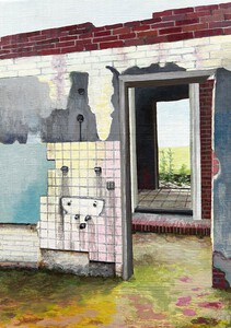 2020In de opgang van een verlaten gebouw in Duitsland trof ik deze wasbak aan, tegen de afbladderende muur, die vele gekleurde verflagen door de jaren heen prijsgaf. Acrylschildering op gerecycled hout, in de achterkant is een inkeping aangebracht, om hem te kunnen ophangen.